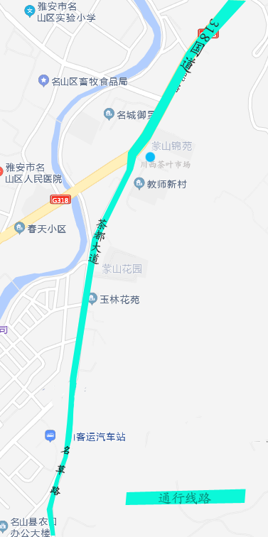 可沿国道318线行驶至川西茶叶市场进入茶都大道,沿茶都大道行驶至新车站进入名草路,往经开区方向行驶前往雅安。